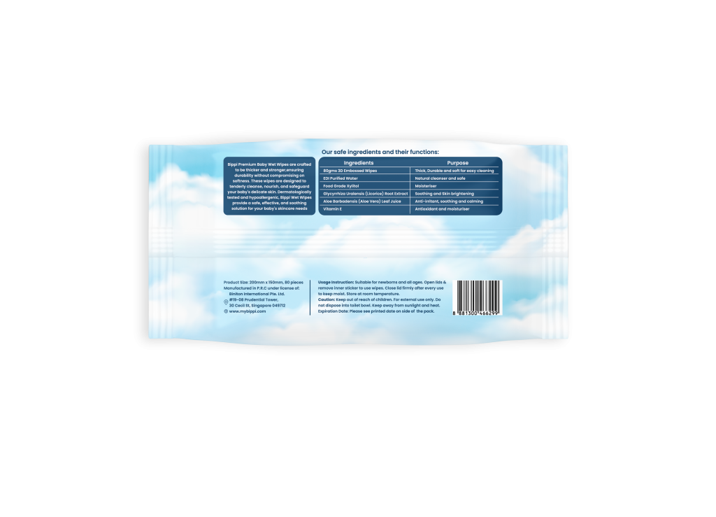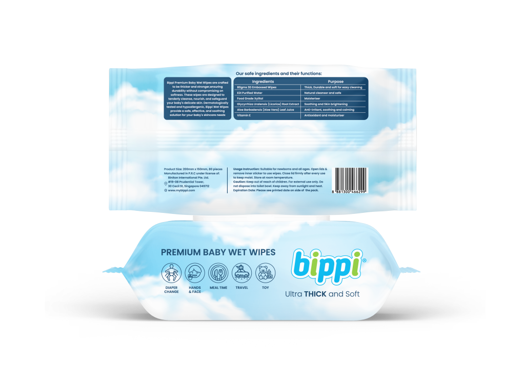 bippi premium baby wet wipes are crafted to be thicker and stronger, ensuring durability without compromising on softness. these wipes are designed to tenderly cleanse, nourish, and safeguard your baby's delicate skin. dermatologically tested and hypoallergenic, bippi wet wipes provide a safe, effective, and soothing solution for your baby's skincare needs.